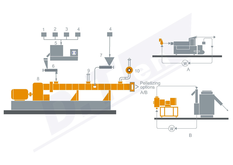 1. 聚合物 2. 弹性体(SBS、SEBS、EPDM等) 3. 软化剂(油) 4. 填充 5. 高速混合机 6. 体积式喂料机 7. 侧向喂料机(可选) 8. 乐竞网页版登录入口 9. 自然排气 10. 强制真空排气 切粒方式: A. 水环模面切粒 B. 水下切粒 |